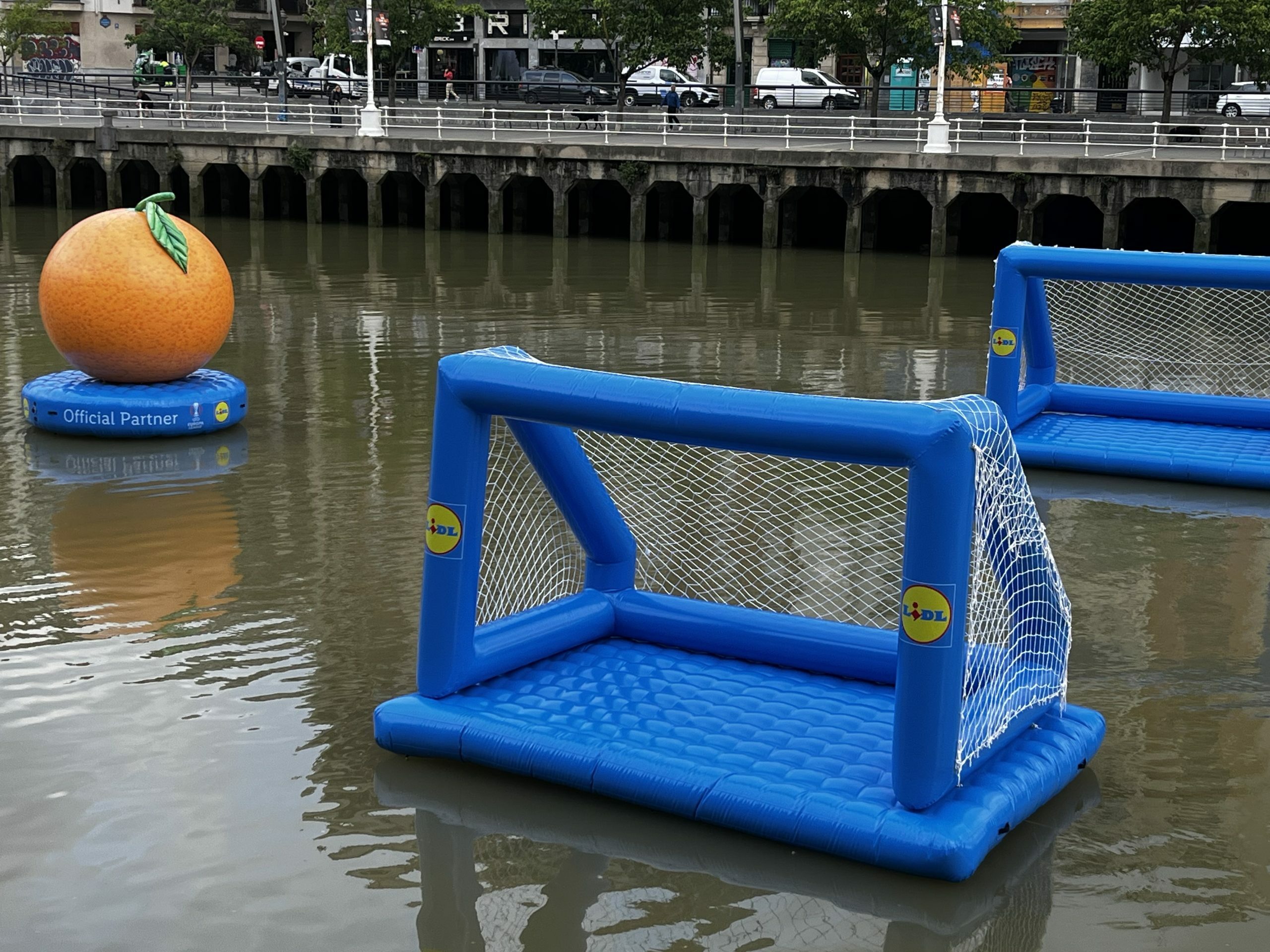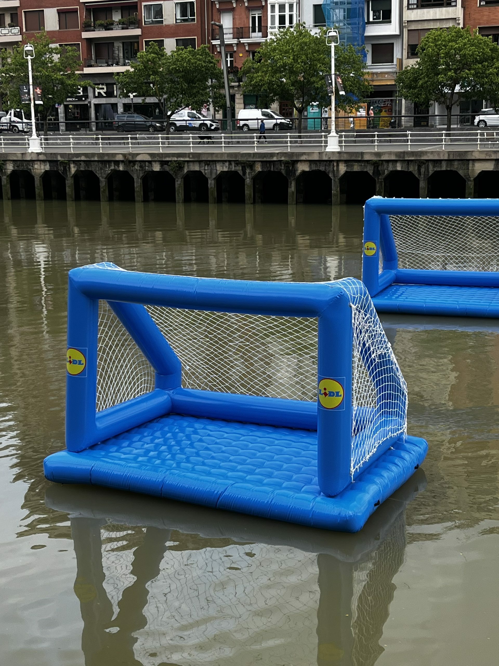 Desde una pantalla de cine flotante gigante o un producto flotante de grandes dimensiones como una botella, un packaging, un coche,… hasta un elemento didáctico como una portería o un green flotante donde desde tierra intentamos acertar mientras vemos la particular publicidad del patrocinador.